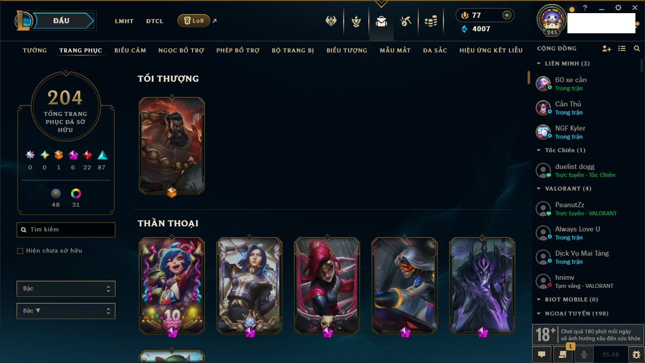 Rank Đơn: Vàng IIKhung: VàngTướng: 170 - Còn 243330 THXTrang Phục: 230Rank ĐTCL: Chưa RankLinh Thú: 68