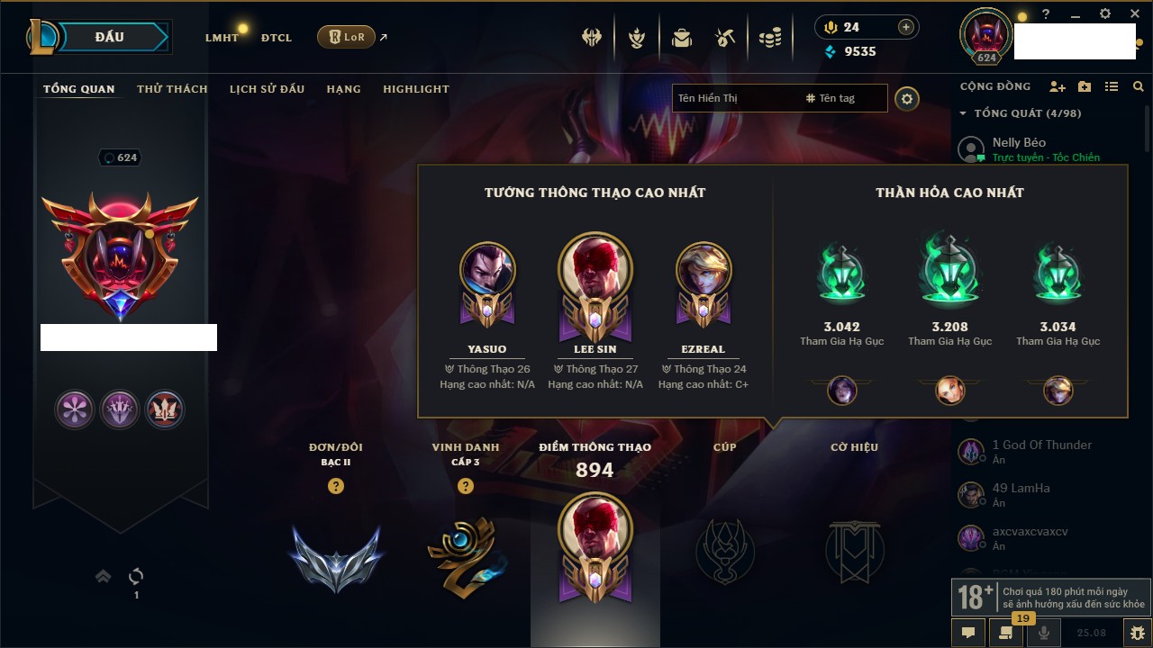 Rank Đơn: Bạch Kim IIKhung: Bạch kimTướng: 171 - Còn 316137 THXTrang Phục: 89Rank ĐTCL: Bạch Kim IIILinh Thú: 94