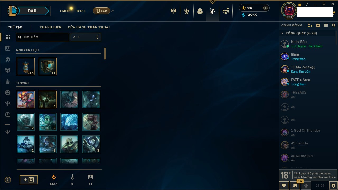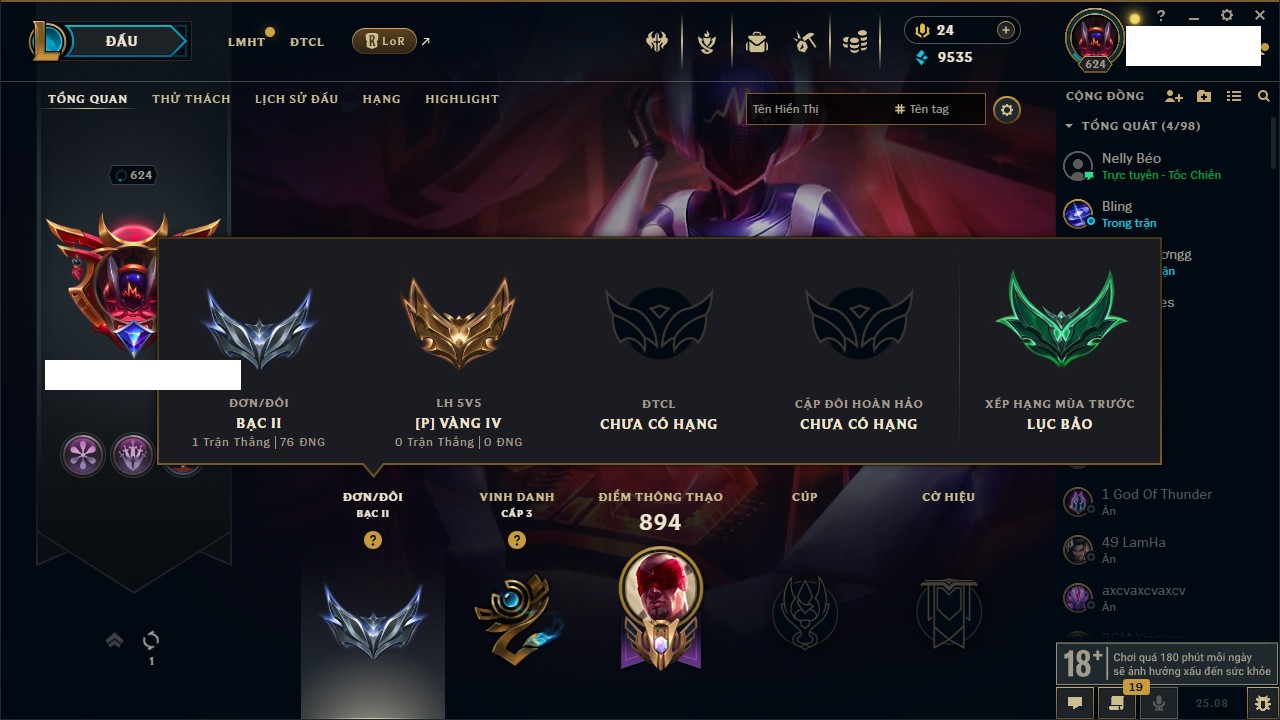 Rank Đơn: Lục Bảo IVKhung: VàngTướng: 171 - Còn 154648 THXTrang Phục: 203Rank ĐTCL: Bạch Kim IVLinh Thú: 69