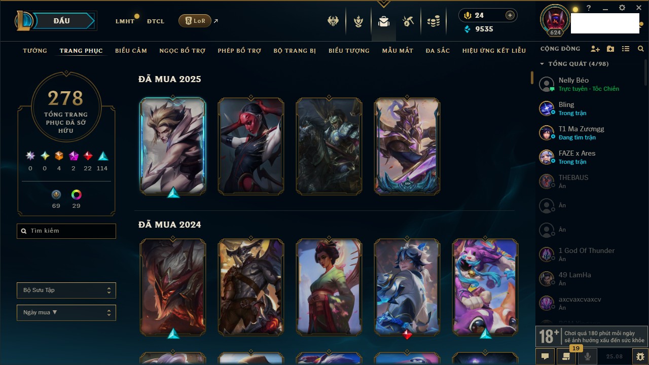 Rank Đơn: Vàng IIKhung: VàngTướng: 170 - Còn 243330 THXTrang Phục: 230Rank ĐTCL: Chưa RankLinh Thú: 68