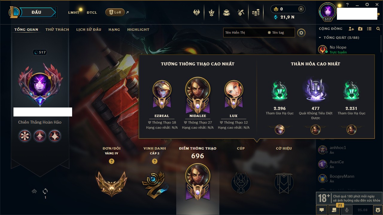 Rank Đơn: Bạch Kim IIIKhung: Bạch kimTướng: 171 - Còn 136108 THXTrang Phục: 261Rank ĐTCL: Bạc IVLinh Thú: 73