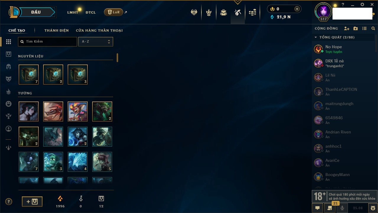 Rank Đơn: Lục Bảo IVKhung: VàngTướng: 171 - Còn 154648 THXTrang Phục: 203Rank ĐTCL: Bạch Kim IVLinh Thú: 69