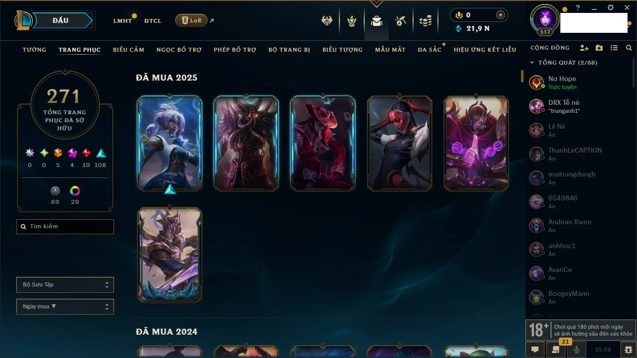 Rank Đơn: Vàng IIKhung: VàngTướng: 170 - Còn 243330 THXTrang Phục: 230Rank ĐTCL: Chưa RankLinh Thú: 68