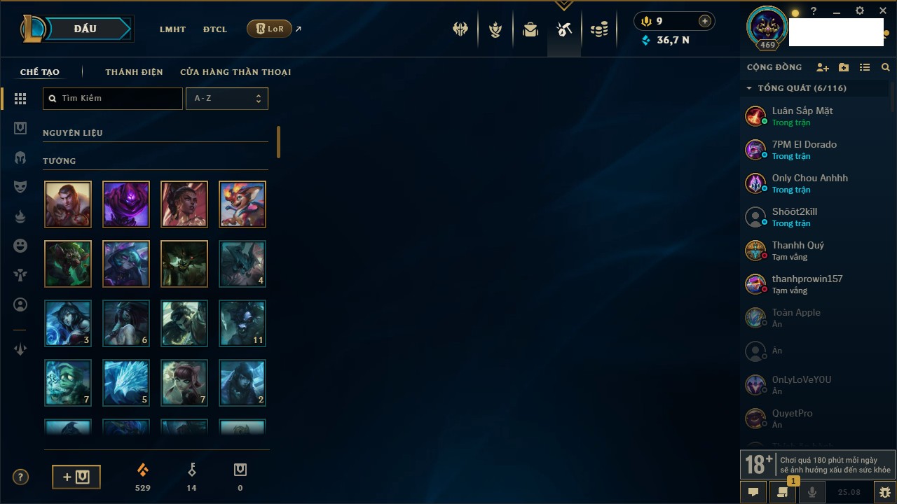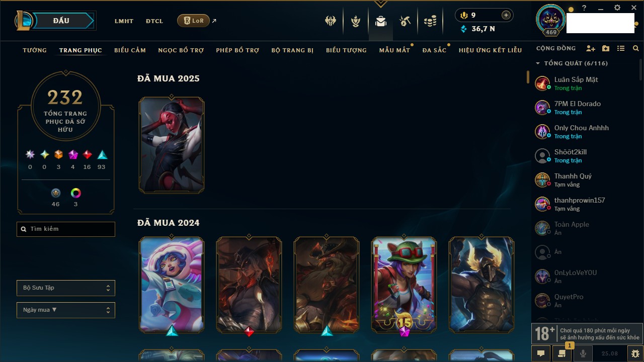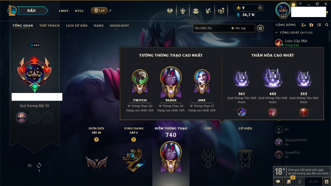 Rank Đơn: Chưa Rank Khung: Chưa có khung Tướng: 170 - Còn 42144 THX Trang Phục: 82 Rank ĐTCL: Chưa Rank Linh Thú: 130