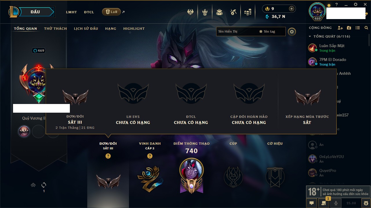 Rank Đơn: Chưa Rank Khung: Bạch kim Tướng: 170 - Còn 34575 THX Trang Phục: 220 Rank ĐTCL: Chưa Rank Linh Thú: 178