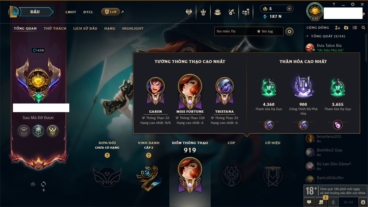 Rank Đơn: Sắt IIIKhung: SắtTướng: 171 - Còn 62070 THXTrang Phục: 198Rank ĐTCL: Bạch Kim IIILinh Thú: 237