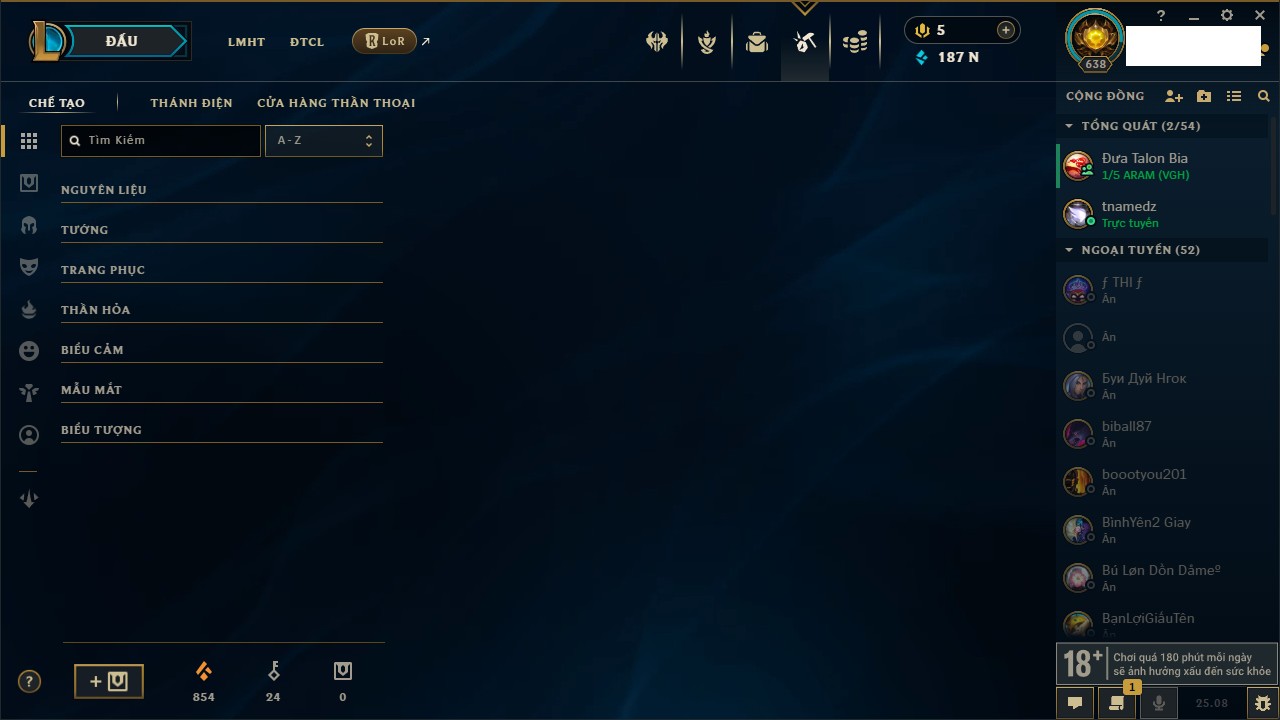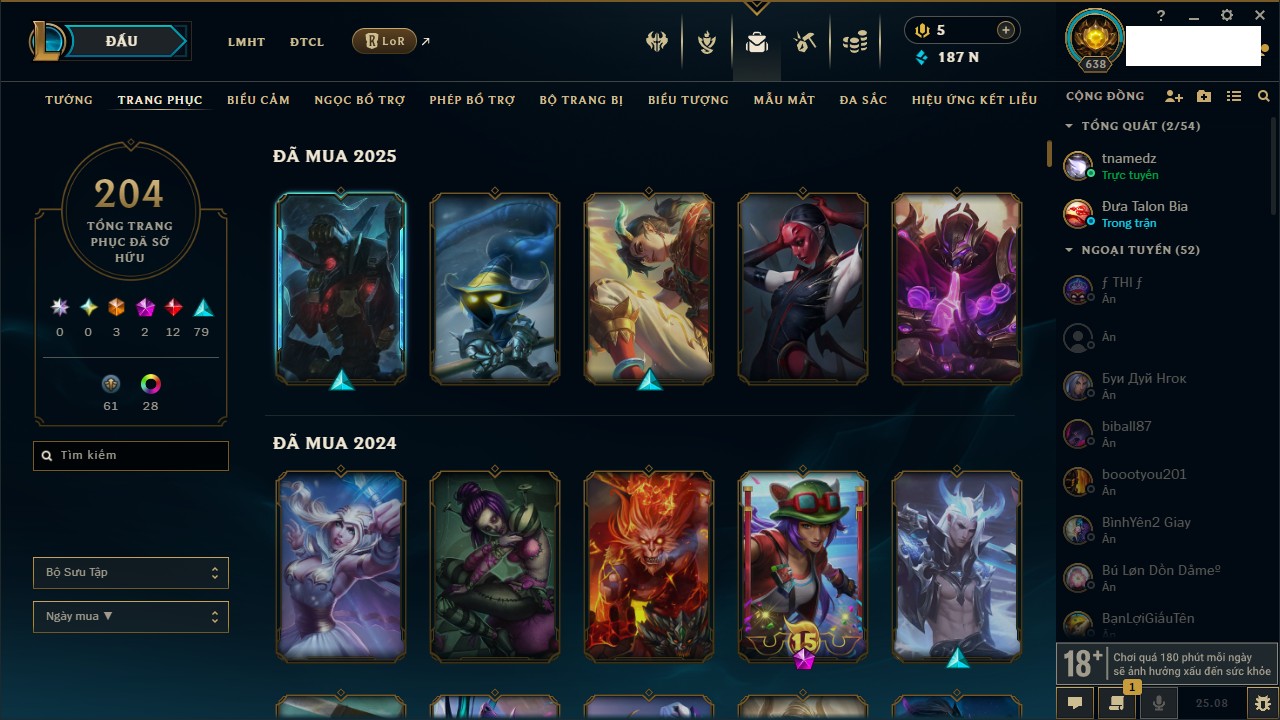 Rank Đơn: Vàng IIIKhung: Bạch kimTướng: 171 - Còn 98230 THXTrang Phục: 235Rank ĐTCL: Vàng IVLinh Thú: 59