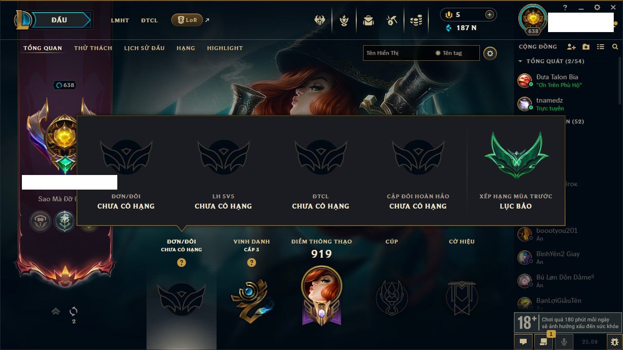 Rank Đơn: Bạc IVKhung: BạcTướng: 171 - Còn 173918 THXTrang Phục: 233Rank ĐTCL: Lục Bảo IIILinh Thú: 26