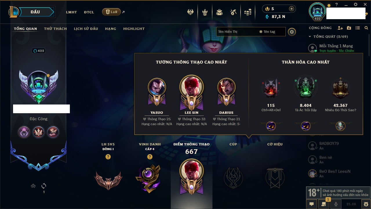 Rank Đơn: Lục Bảo IVKhung: Bạch kimTướng: 171 - Còn 128452 THXTrang Phục: 193Rank ĐTCL: Bạc IIILinh Thú: 100