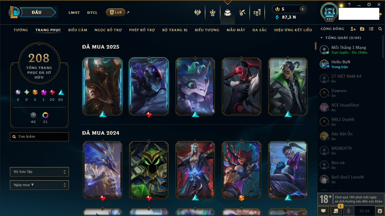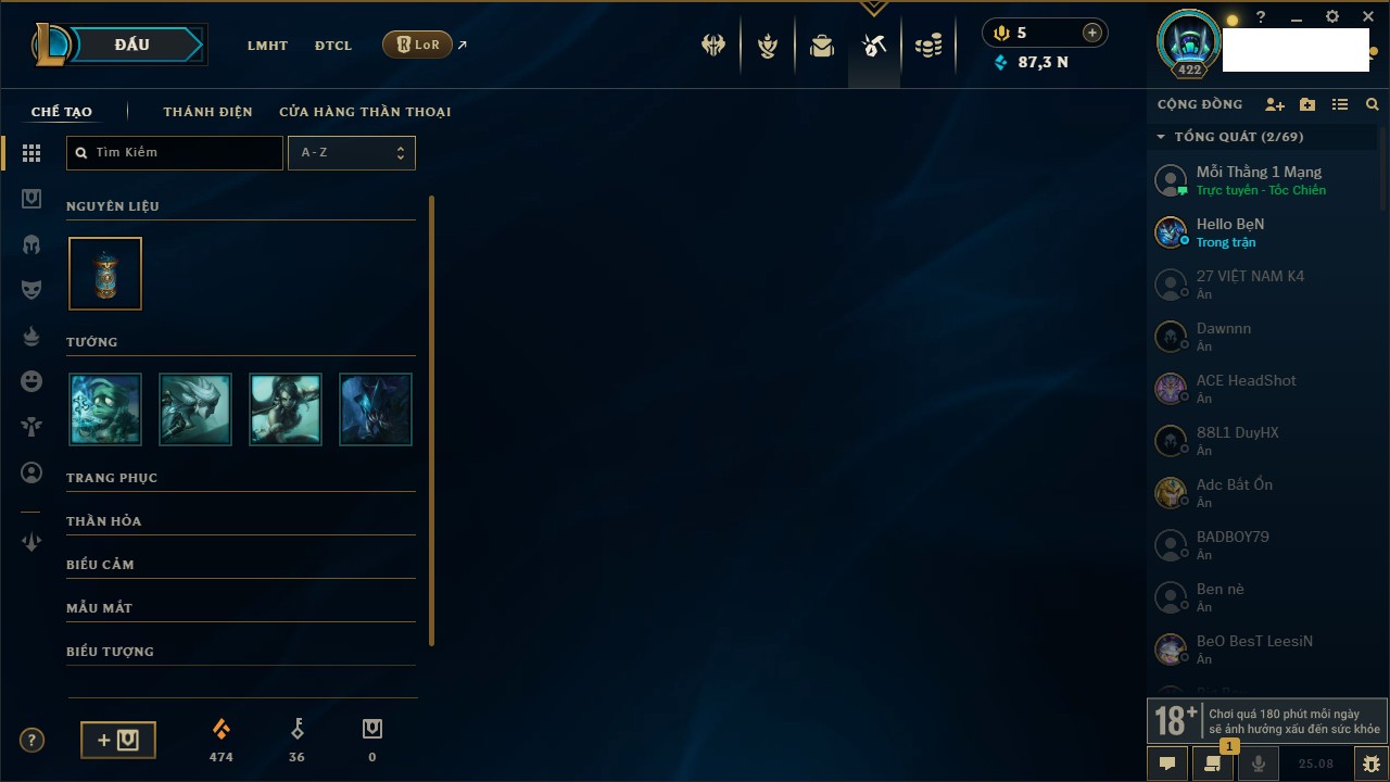 Rank Đơn: Vàng IIIKhung: BạcTướng: 171 - Còn 101359 THXTrang Phục: 88Rank ĐTCL: Kim Cương IVLinh Thú: 200