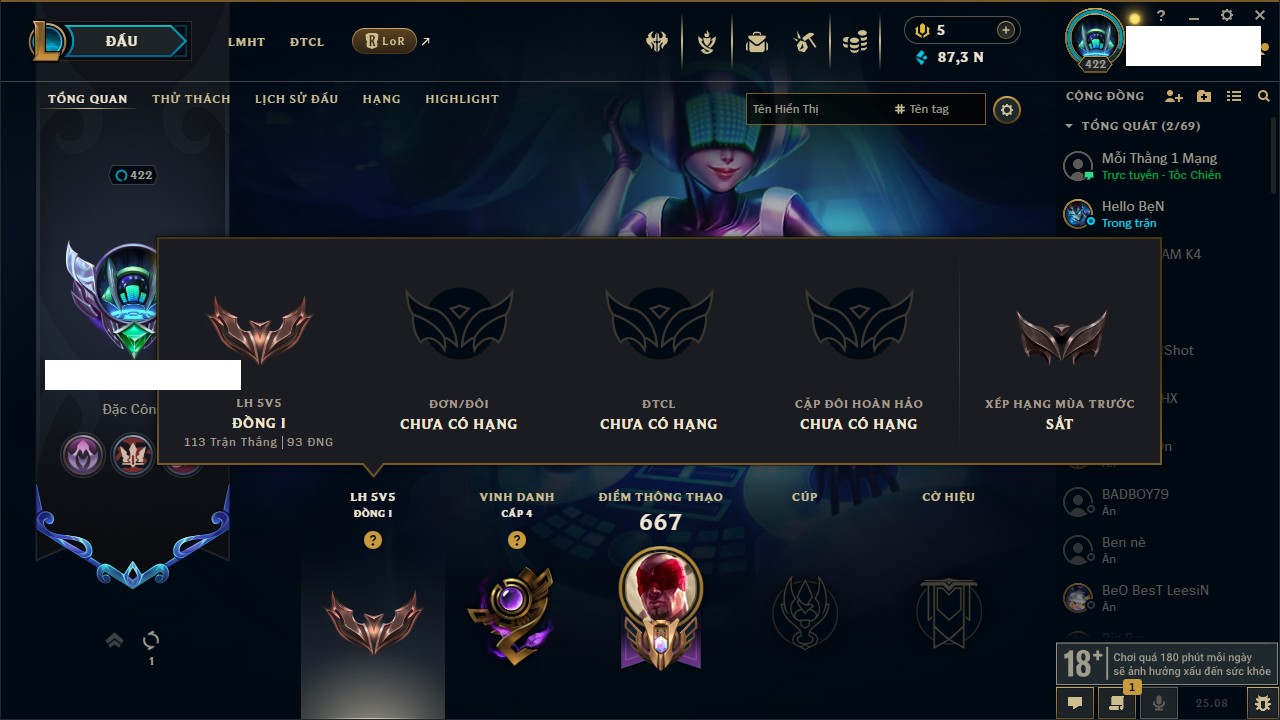 Rank Đơn: Đồng IIKhung: ĐồngTướng: 170 - Còn 66145 THXTrang Phục: 215Rank ĐTCL: Chưa RankLinh Thú: 52