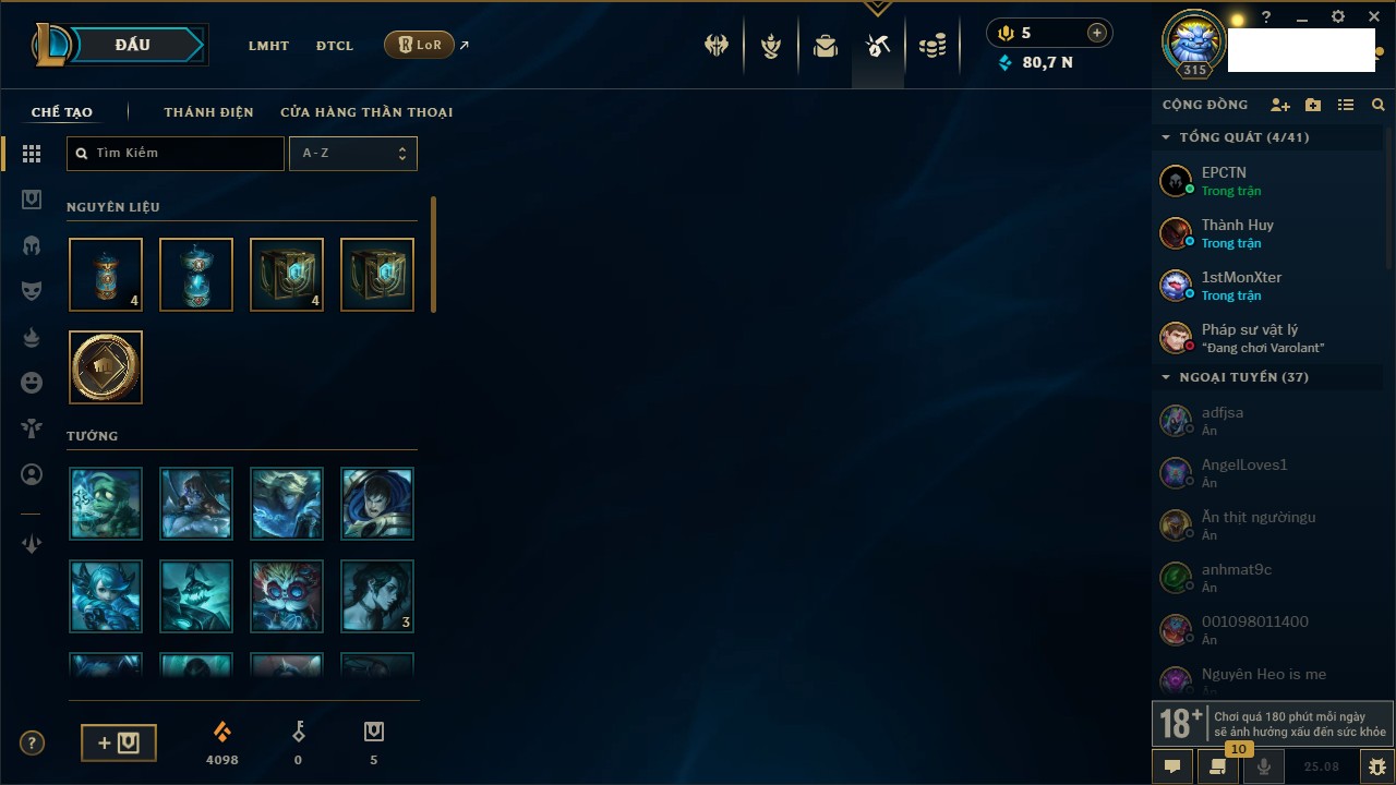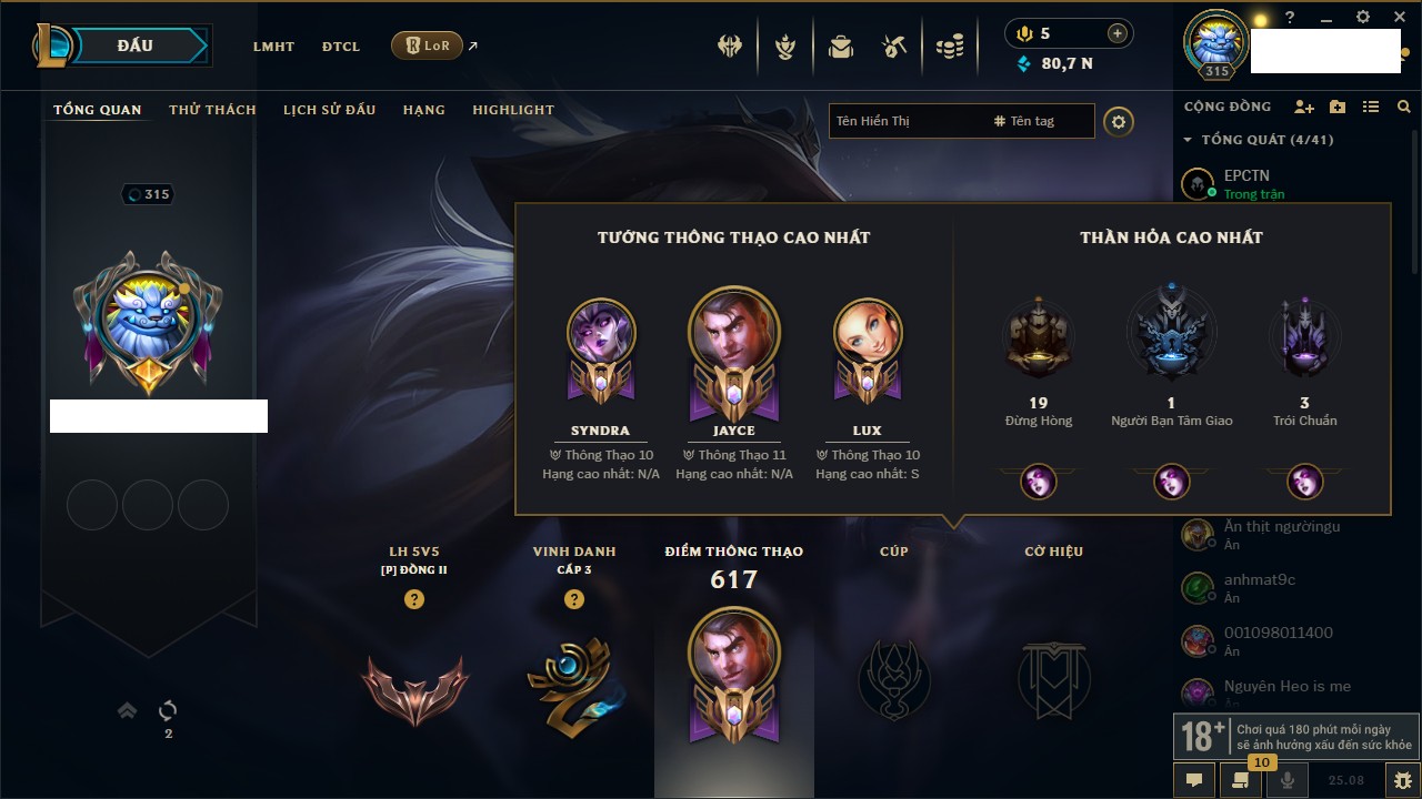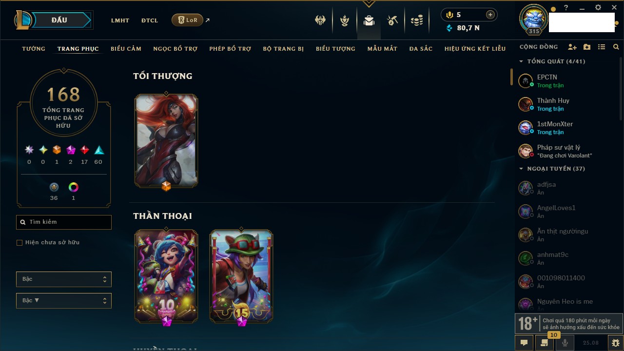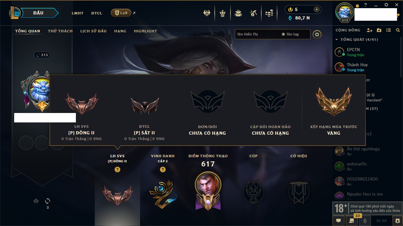 Rank Đơn: Vàng IKhung: BạcTướng: 171 - Còn 60584 THXTrang Phục: 286Rank ĐTCL: Vàng IIILinh Thú: 117