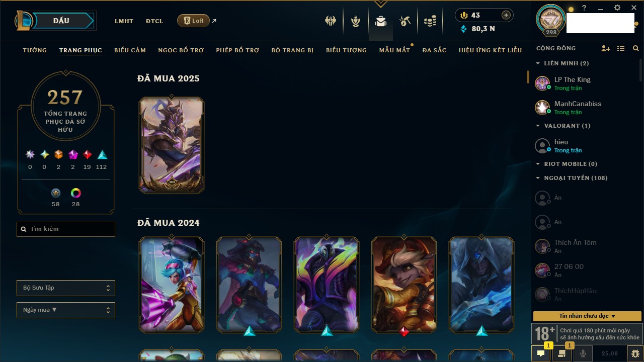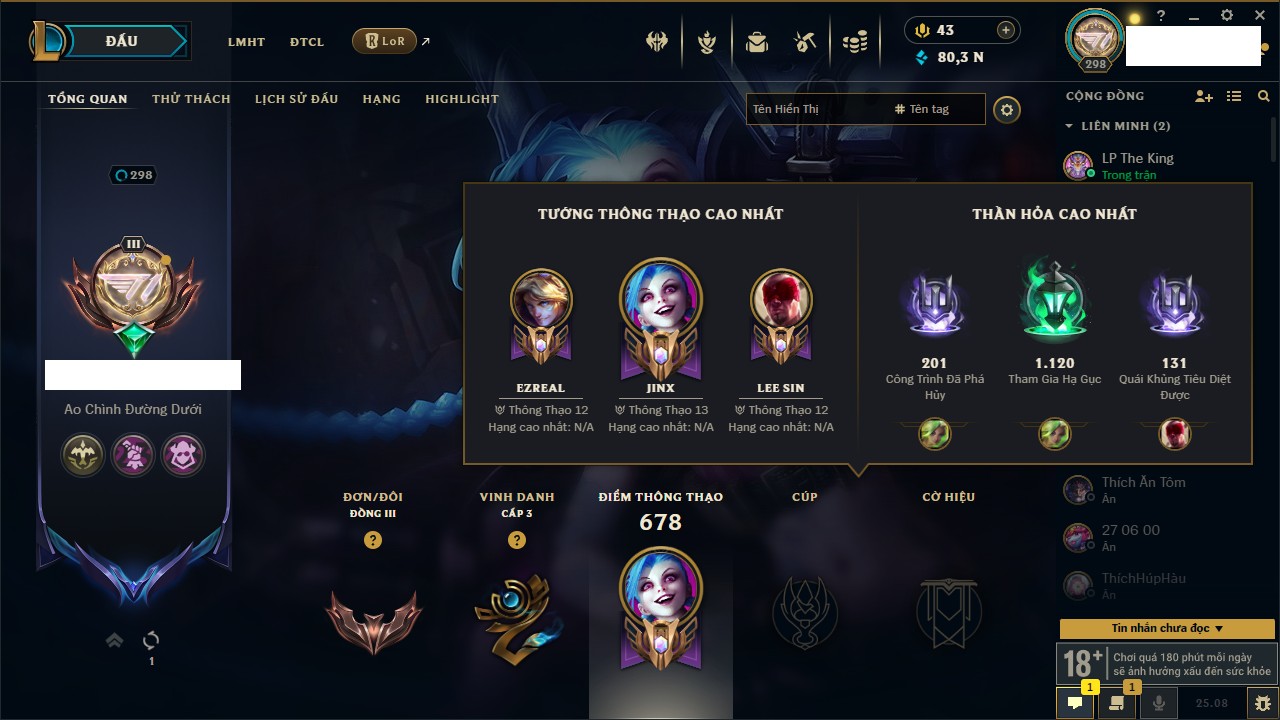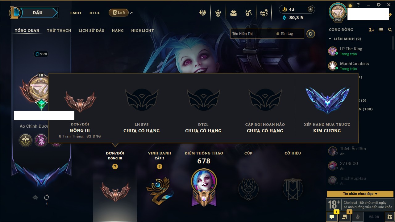 Rank Đơn: Đồng III Khung: Bạc Tướng: 170 - Còn 80399 THX Trang Phục: 257 Rank ĐTCL: Chưa Rank Linh Thú: 155