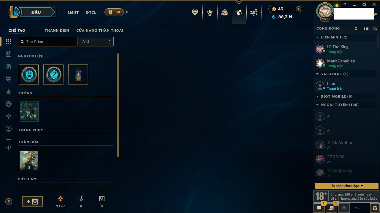 Rank Đơn: Chưa rank mùa nào Khung: Chưa có khung Tướng: 48 - Còn 9500 THX Trang Phục: 12 Rank ĐTCL: Kim Cương II Linh Thú: 128