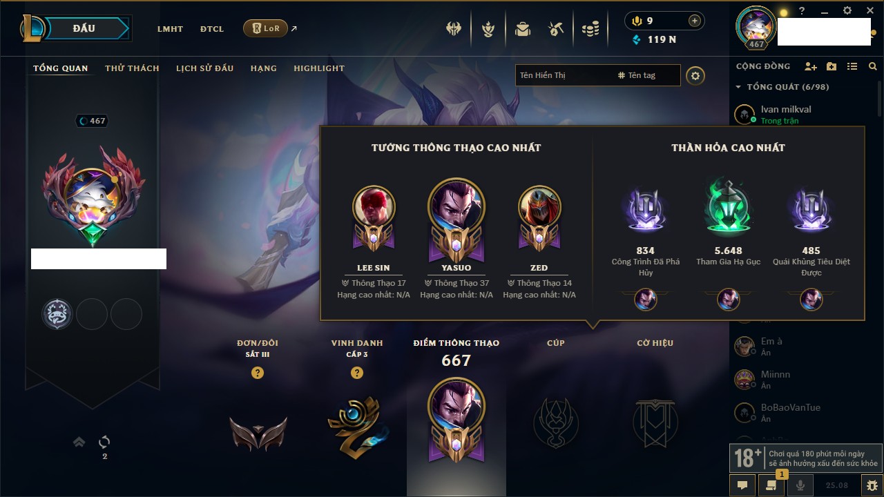 Rank Đơn: Đồng IIIKhung: ĐồngTướng: 170 - Còn 48082 THXTrang Phục: 272Rank ĐTCL: Chưa RankLinh Thú: 84