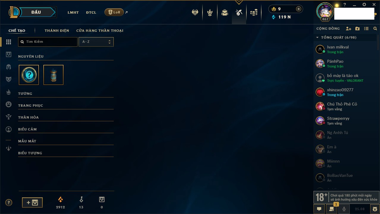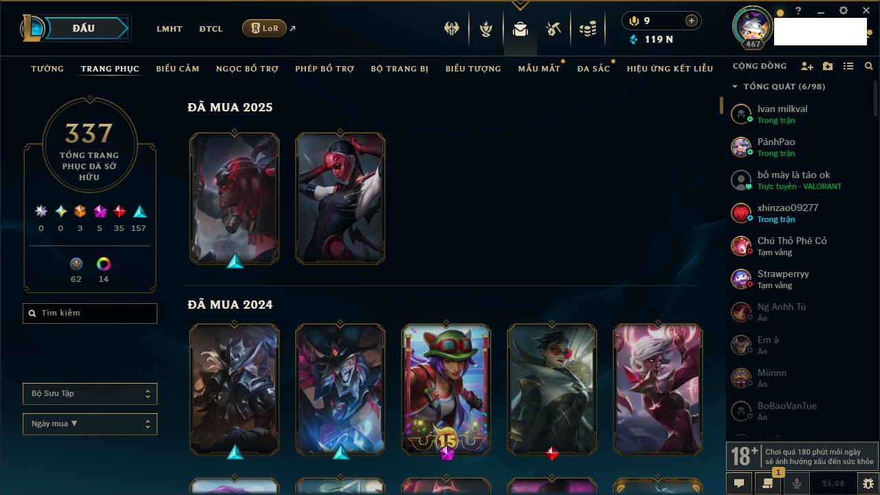 Rank Đơn: Vàng IKhung: Bạch kimTướng: 170 - Còn 212450 THXTrang Phục: 214Rank ĐTCL: Bạch Kim IVLinh Thú: 221