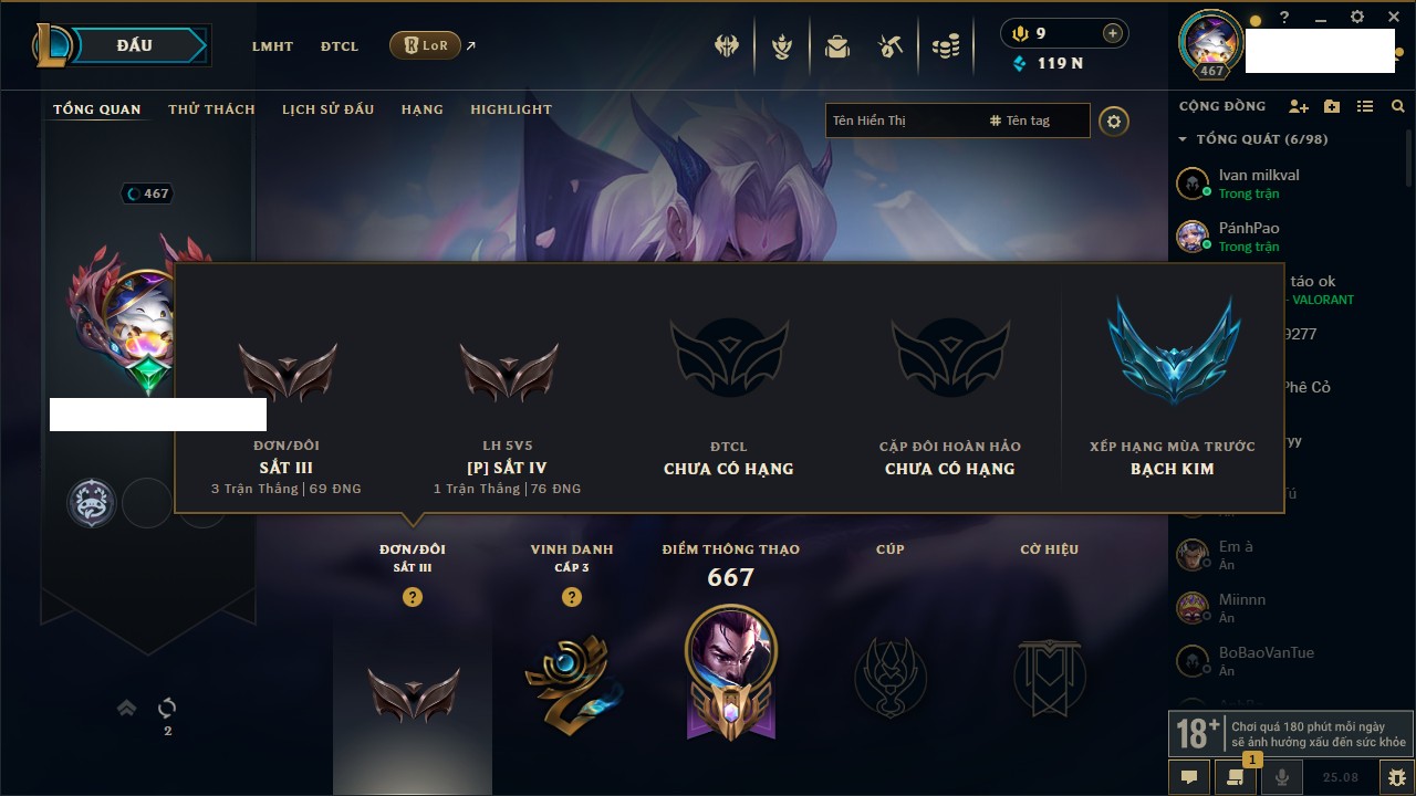 Rank Đơn: Bạch Kim IVKhung: Bạch kimTướng: 171 - Còn 182788 THXTrang Phục: 158Rank ĐTCL: Lục Bảo IVLinh Thú: 56