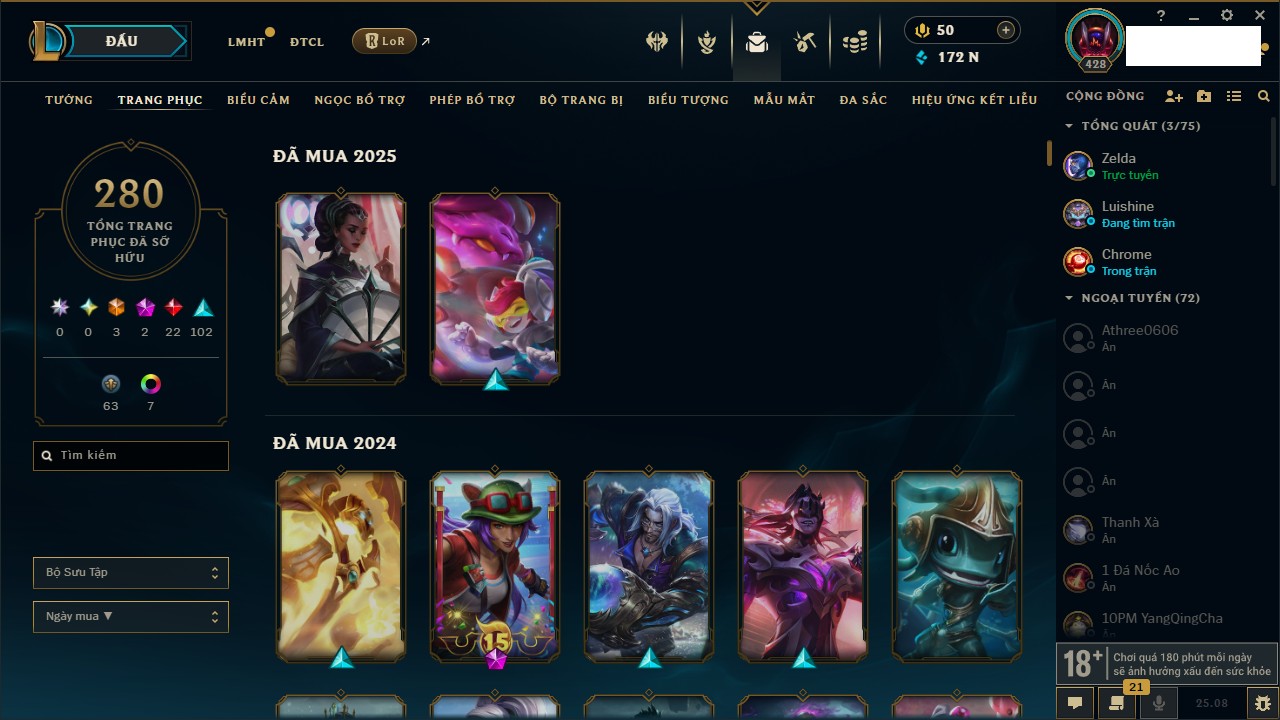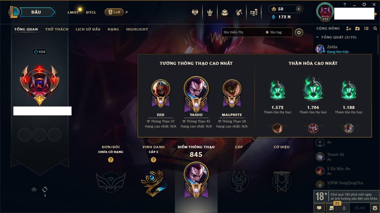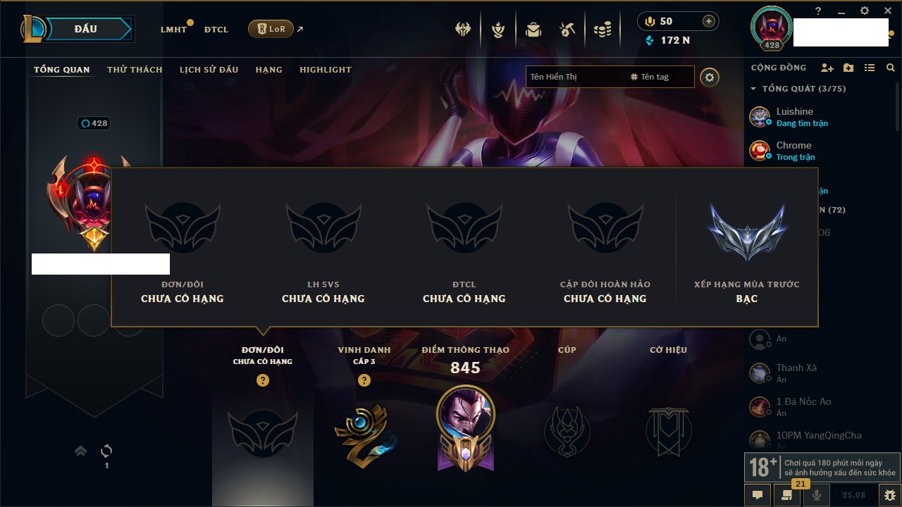 Rank Đơn: Chưa RankKhung: Bạch kimTướng: 86 - Còn 1608 THXTrang Phục: 47Rank ĐTCL: Chưa RankLinh Thú: 58