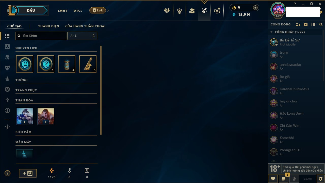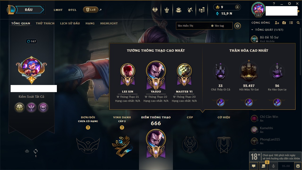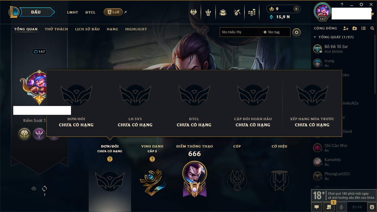 Rank Đơn: Vàng IKhung: BạcTướng: 171 - Còn 60584 THXTrang Phục: 286Rank ĐTCL: Vàng IIILinh Thú: 117