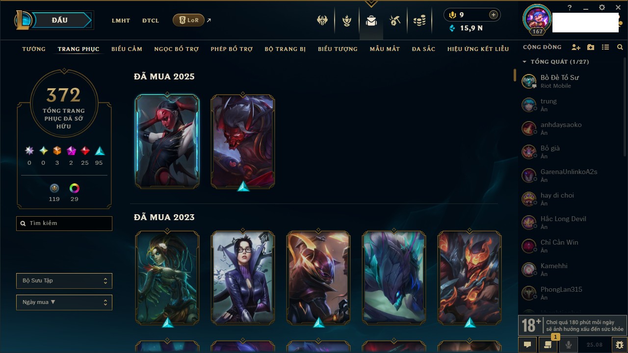 Rank Đơn: Vàng IIIKhung: VàngTướng: 171 - Còn 88128 THXTrang Phục: 329Rank ĐTCL: Chưa RankLinh Thú: 41