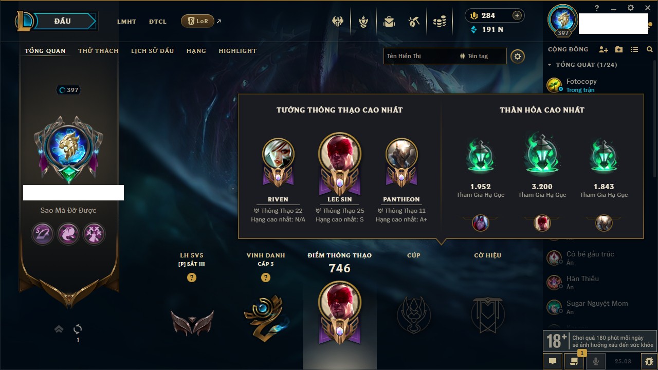 Rank Đơn: Vàng IVKhung: BạcTướng: 166 - Còn 180925 THXTrang Phục: 163Rank ĐTCL: Chưa RankLinh Thú: 67
