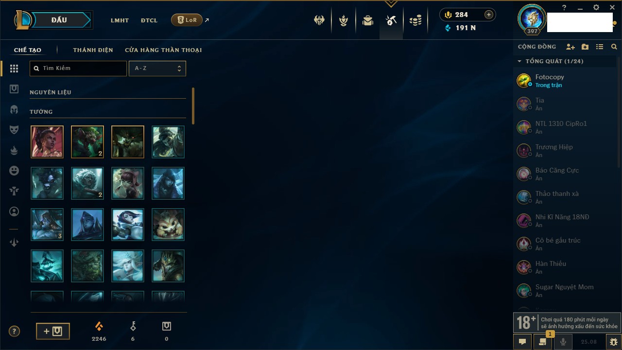 Rank Đơn: Vàng IVKhung: VàngTướng: 171 - Còn 48721 THXTrang Phục: 171Rank ĐTCL: Chưa RankLinh Thú: 27