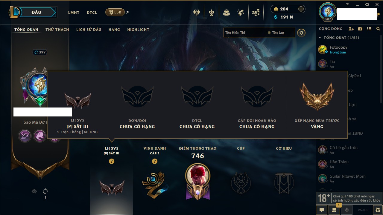 Rank Đơn: Sắt IKhung: SắtTướng: 171 - Còn 125789 THXTrang Phục: 151Rank ĐTCL: Đồng IIILinh Thú: 72