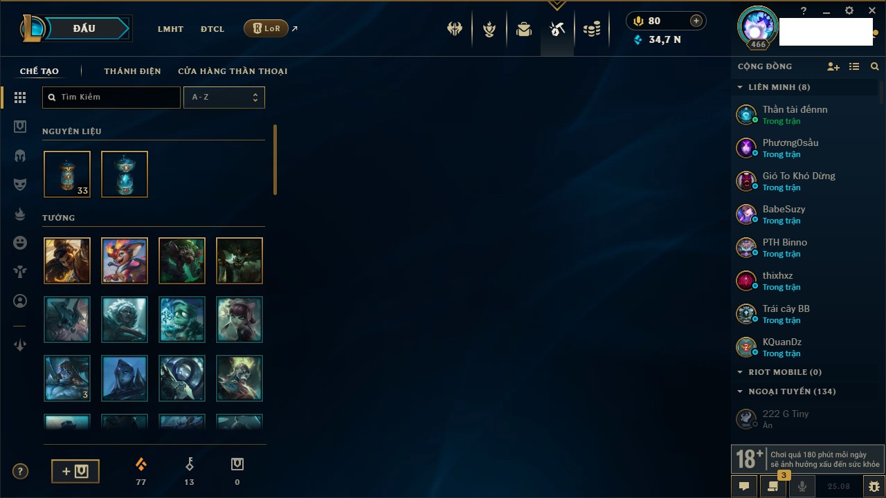 Rank Đơn: Bạc IIKhung: Bạch kimTướng: 169 - Còn 81813 THXTrang Phục: 301Rank ĐTCL: Chưa RankLinh Thú: 140