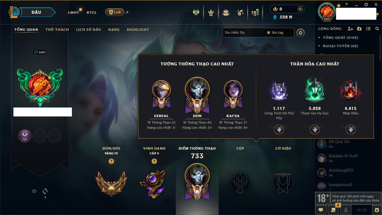 Rank Đơn: Lục Bảo IVKhung: VàngTướng: 171 - Còn 154648 THXTrang Phục: 203Rank ĐTCL: Bạch Kim IVLinh Thú: 69