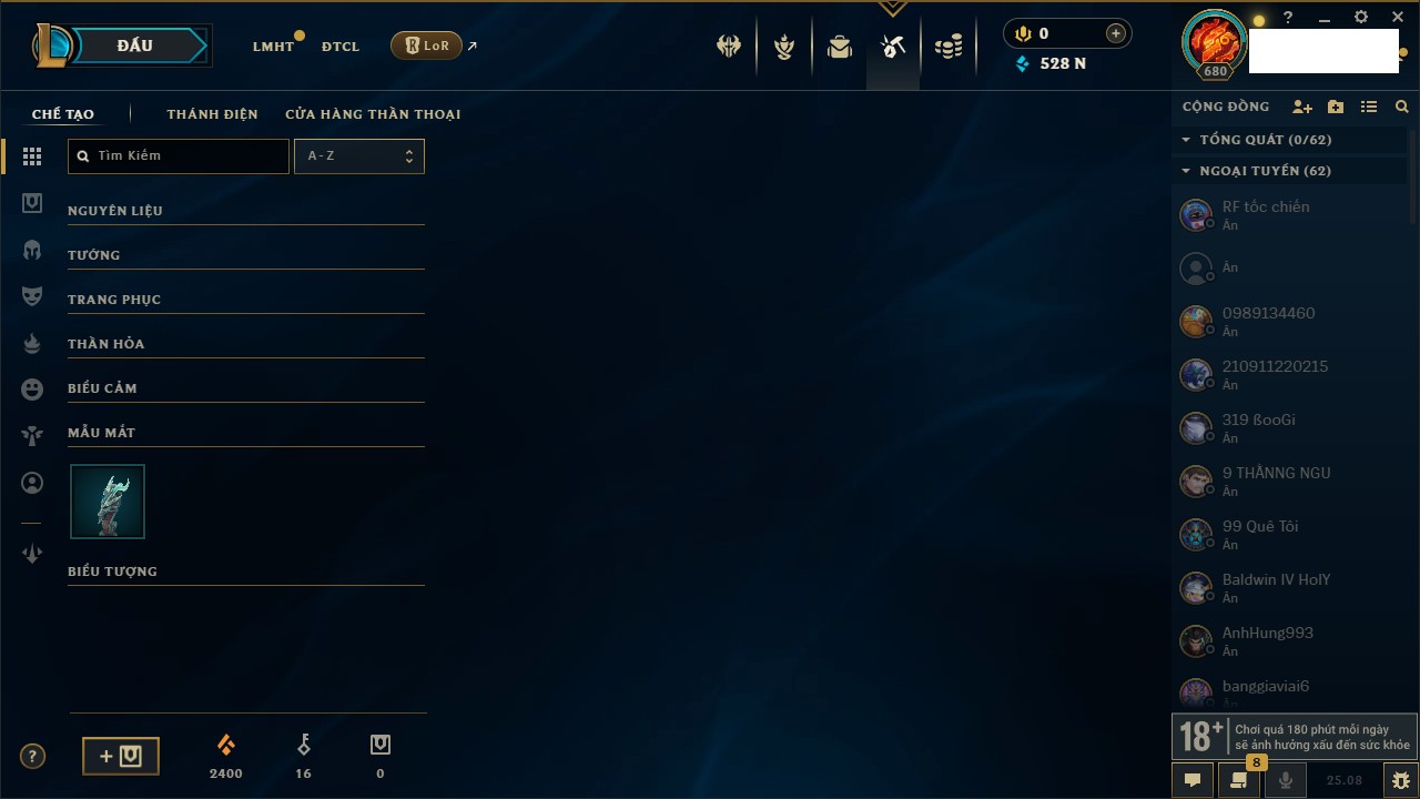 Rank Đơn: Bạc IIIKhung: BạcTướng: 171 - Còn 190352 THXTrang Phục: 260Rank ĐTCL: Sắt IILinh Thú: 31