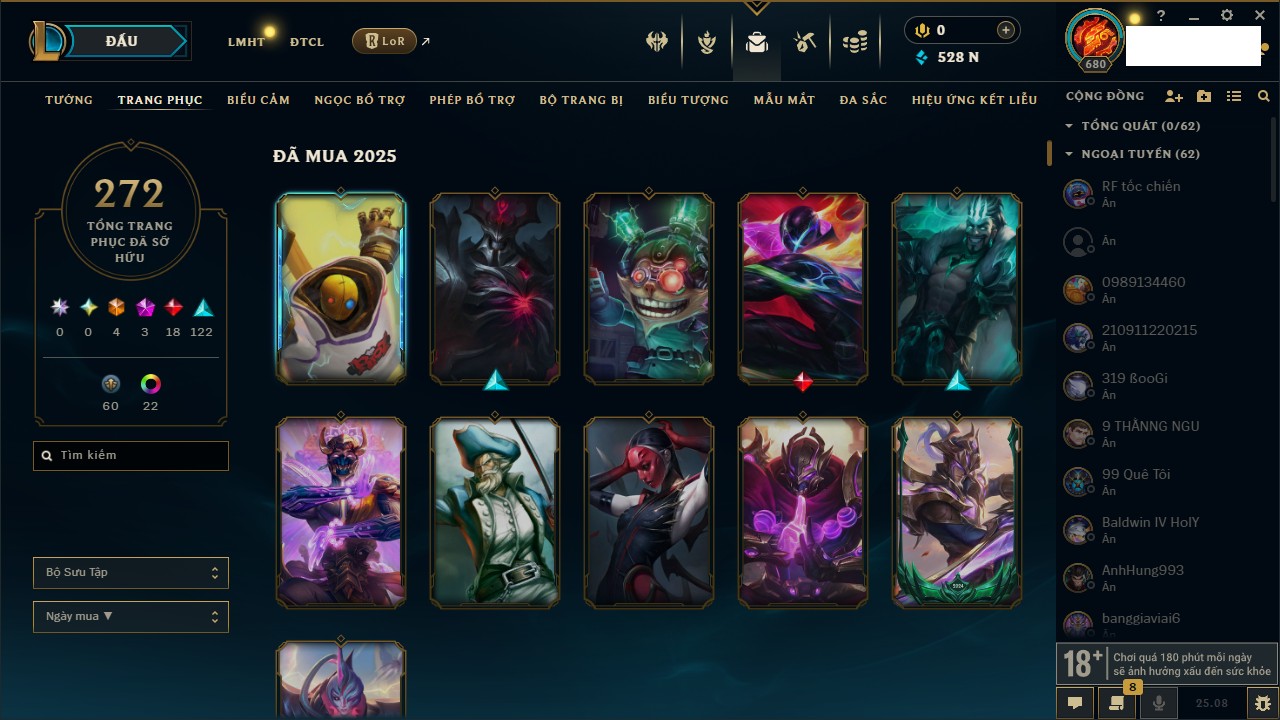 Rank Đơn: Bạch Kim IIIKhung: Bạch kimTướng: 171 - Còn 136108 THXTrang Phục: 261Rank ĐTCL: Bạc IVLinh Thú: 73