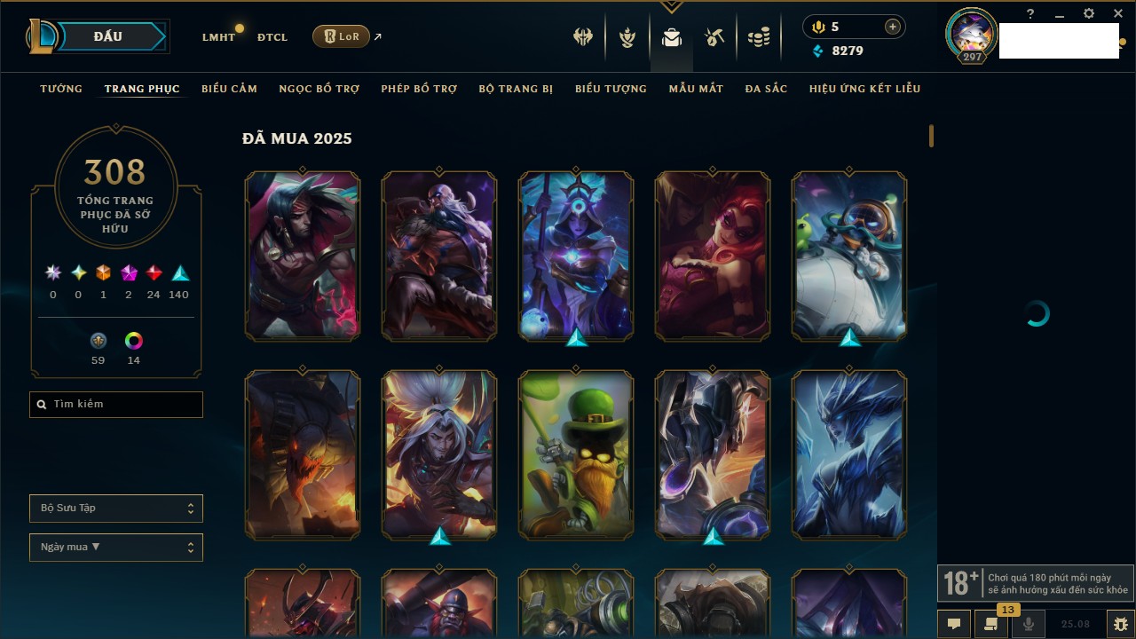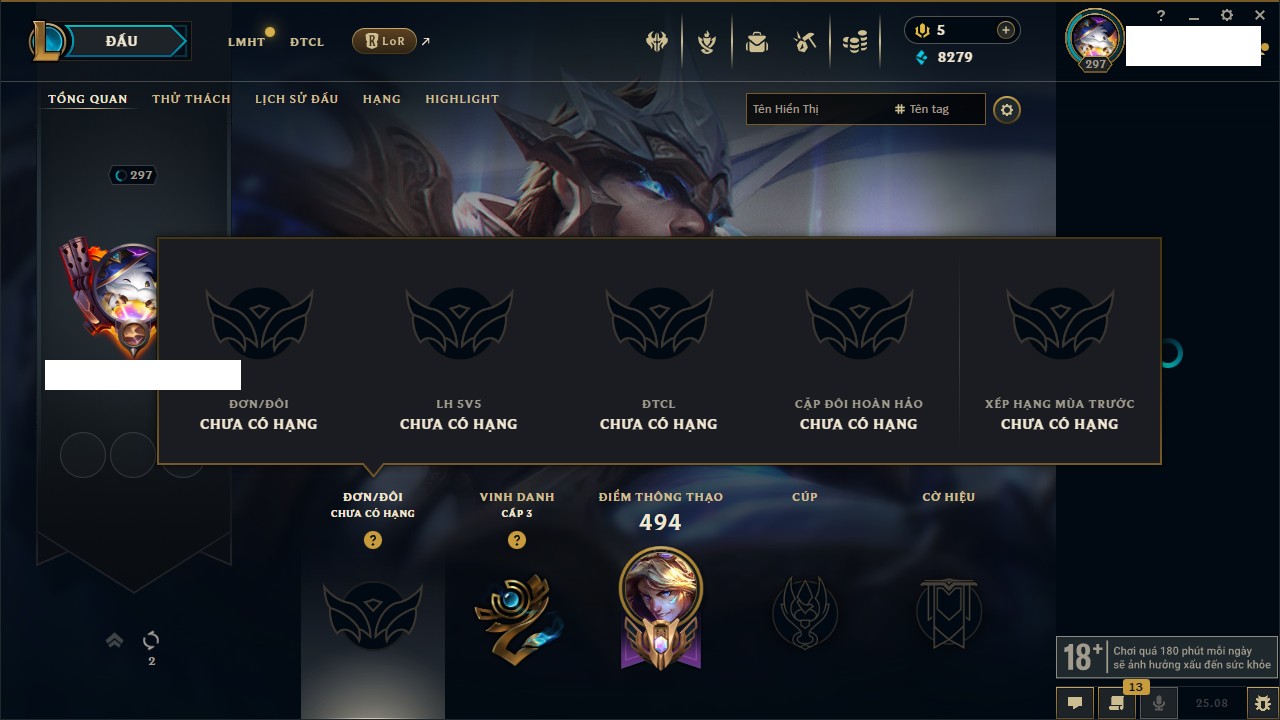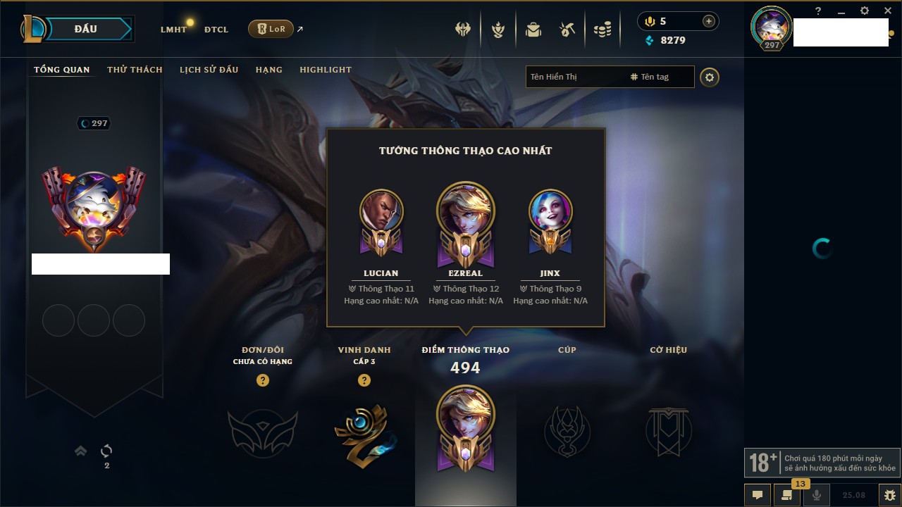 Rank Đơn: Bạch Kim IIKhung: Bạch kimTướng: 171 - Còn 316137 THXTrang Phục: 89Rank ĐTCL: Bạch Kim IIILinh Thú: 94