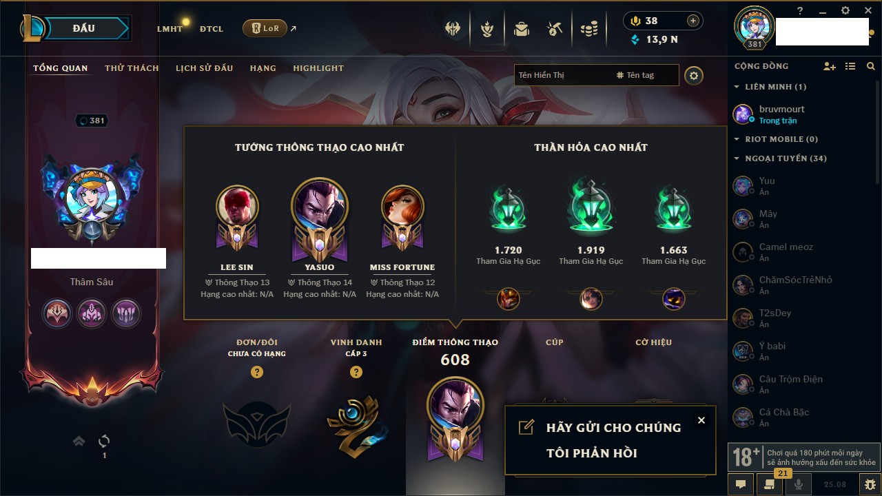 Rank Đơn: Bạch Kim IIIKhung: Bạch kimTướng: 170 - Còn 61079 THXTrang Phục: 352Rank ĐTCL: Sắt IILinh Thú: 70