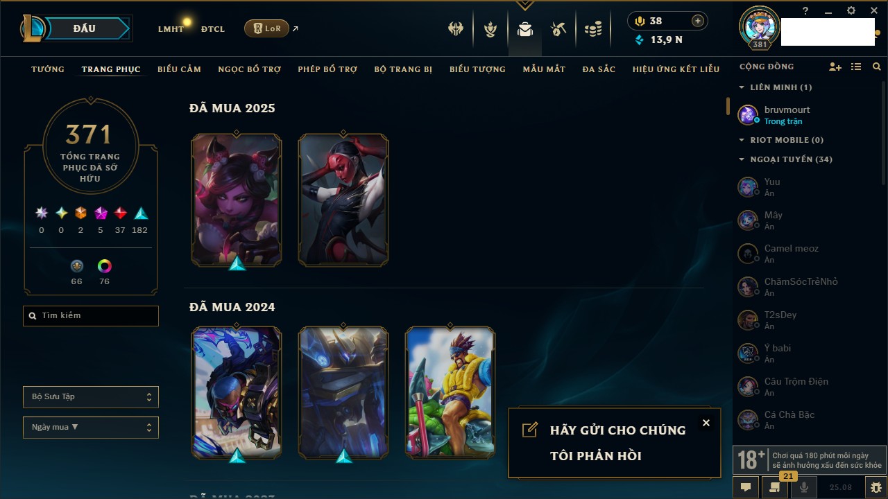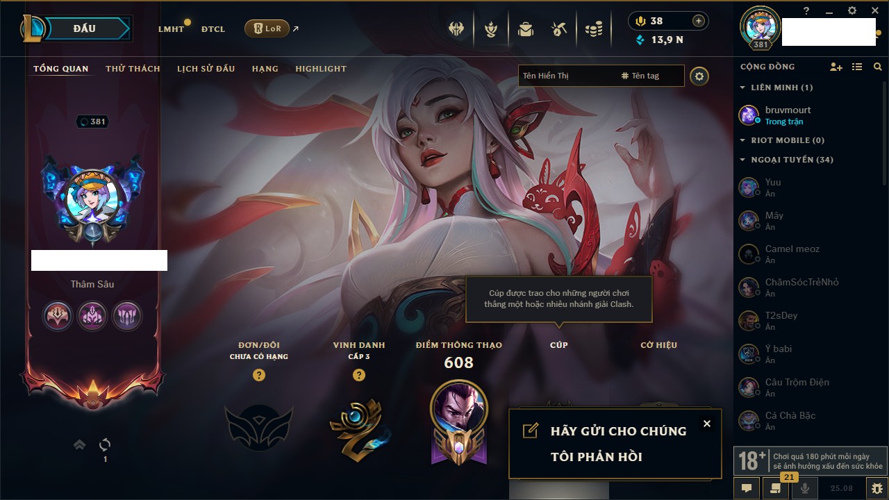 Rank Đơn: Vàng IKhung: Bạch kimTướng: 170 - Còn 212450 THXTrang Phục: 214Rank ĐTCL: Bạch Kim IVLinh Thú: 221