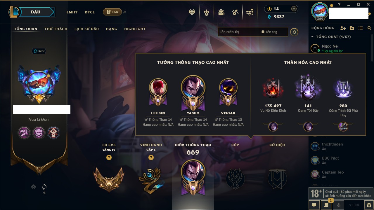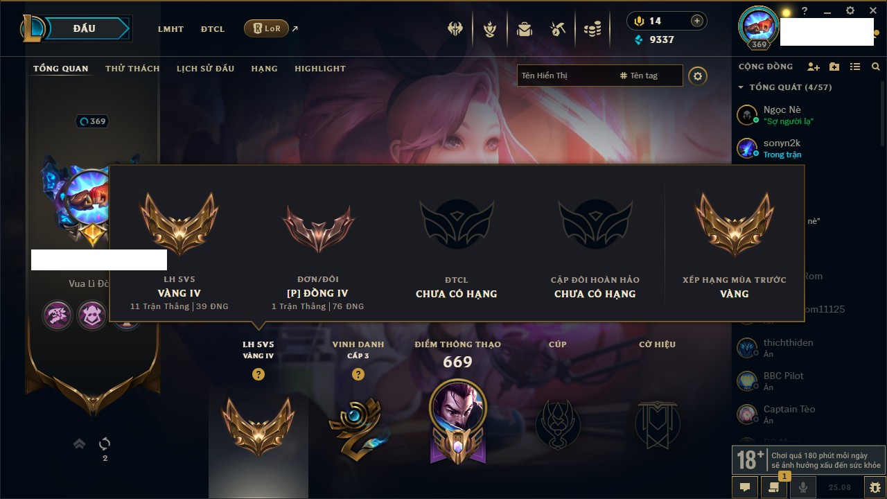 Rank Đơn: Vàng IIKhung: Bạch kimTướng: 172 - Còn 123420 THXTrang Phục: 231Rank ĐTCL: Bạch Kim IVLinh Thú: 213