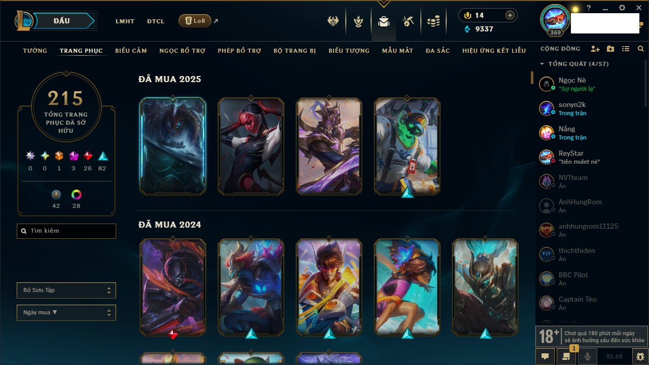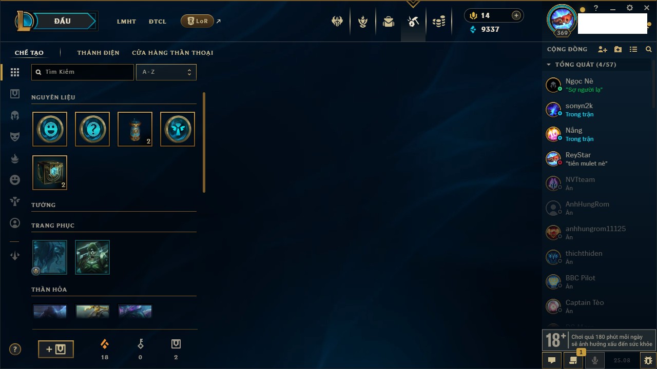 Rank Đơn: Bạch Kim IVKhung: VàngTướng: 170 - Còn 34137 THXTrang Phục: 209Rank ĐTCL: Chưa RankLinh Thú: 108