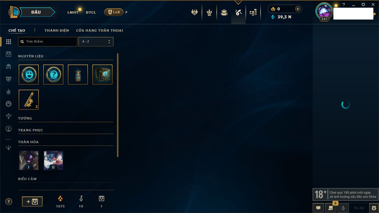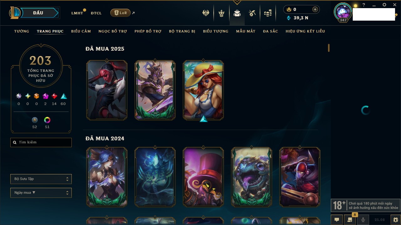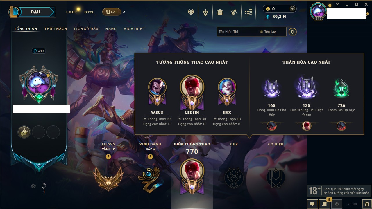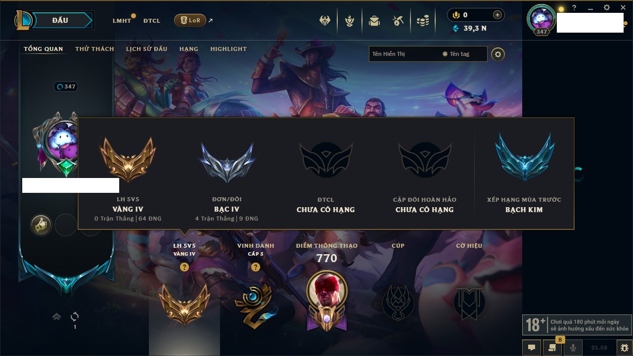 Rank Đơn: Bạc IIIKhung: BạcTướng: 171 - Còn 51045 THXTrang Phục: 220Rank ĐTCL: Sắt IILinh Thú: 141