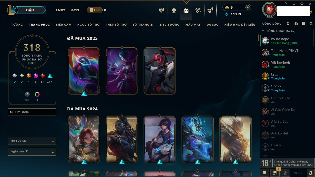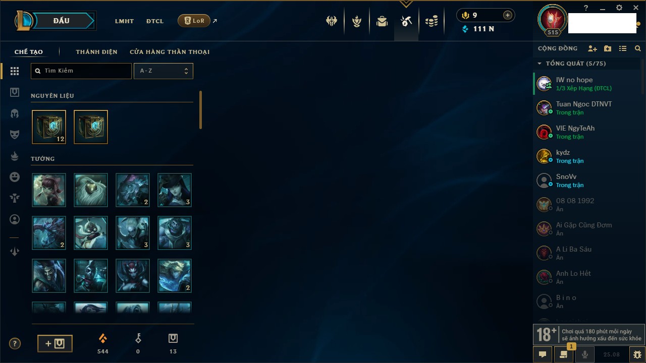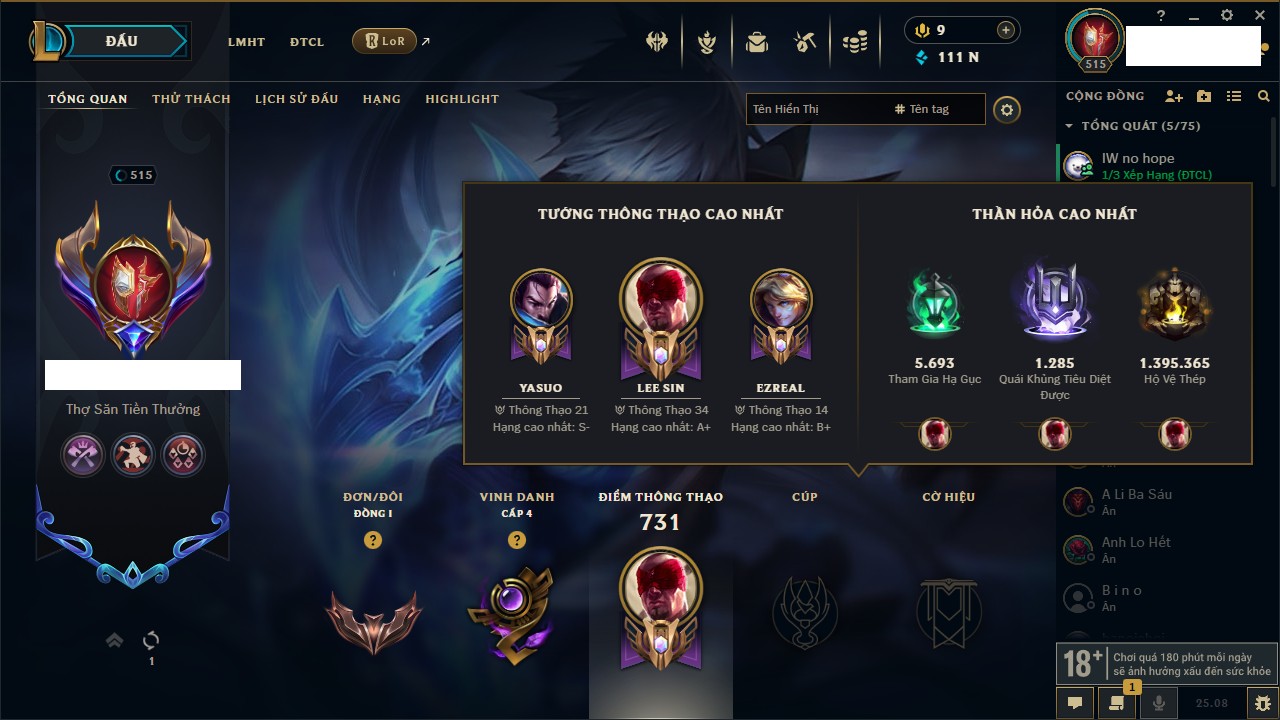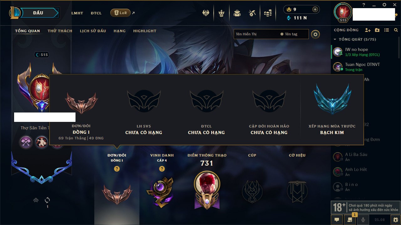 Rank Đơn: Vàng IKhung: Bạch kimTướng: 170 - Còn 212450 THXTrang Phục: 214Rank ĐTCL: Bạch Kim IVLinh Thú: 221