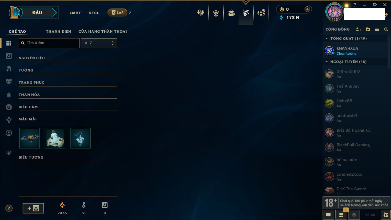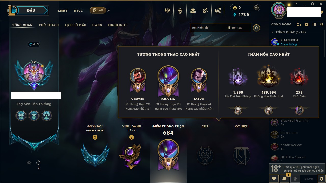 Rank Đơn: Bạch Kim IIIKhung: Bạch kimTướng: 171 - Còn 251383 THXTrang Phục: 229Rank ĐTCL: Sắt IILinh Thú: 51