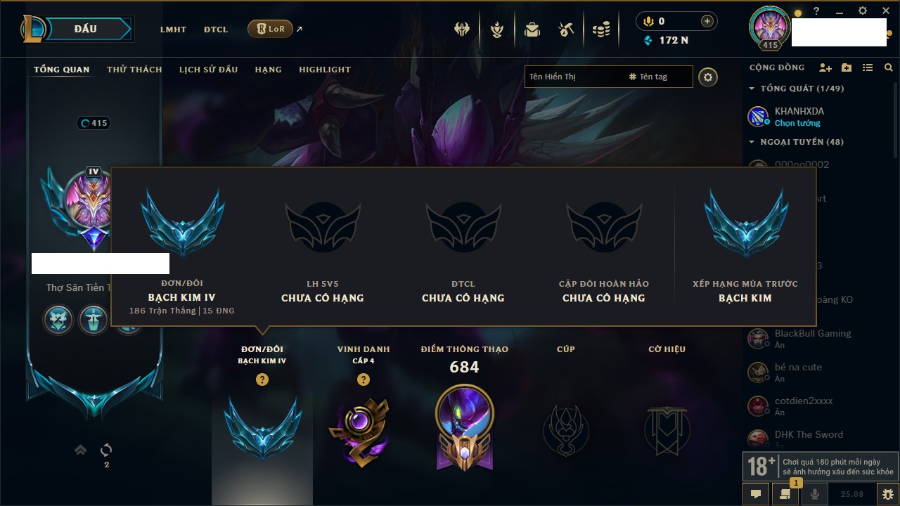 Rank Đơn: Vàng IKhung: BạcTướng: 171 - Còn 60584 THXTrang Phục: 286Rank ĐTCL: Vàng IIILinh Thú: 117