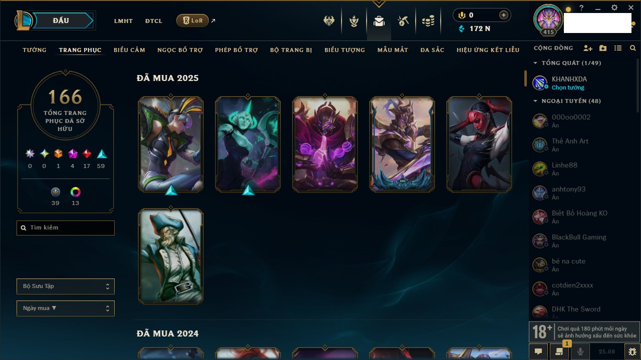 Rank Đơn: Vàng IIIKhung: VàngTướng: 171 - Còn 88128 THXTrang Phục: 329Rank ĐTCL: Chưa RankLinh Thú: 41