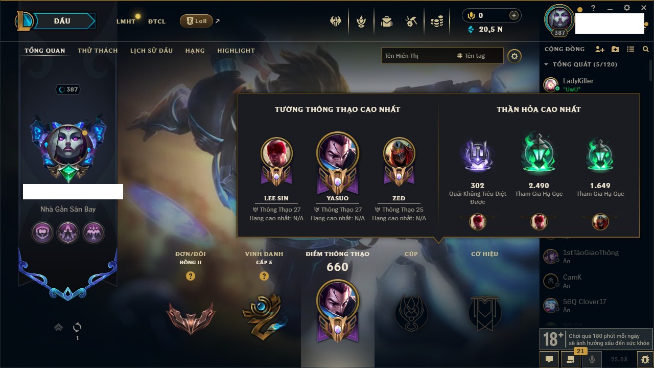 Rank Đơn: Sắt IVKhung: Chưa có khungTướng: 171 - Còn 9586 THXTrang Phục: 280Rank ĐTCL: Chưa RankLinh Thú: 114