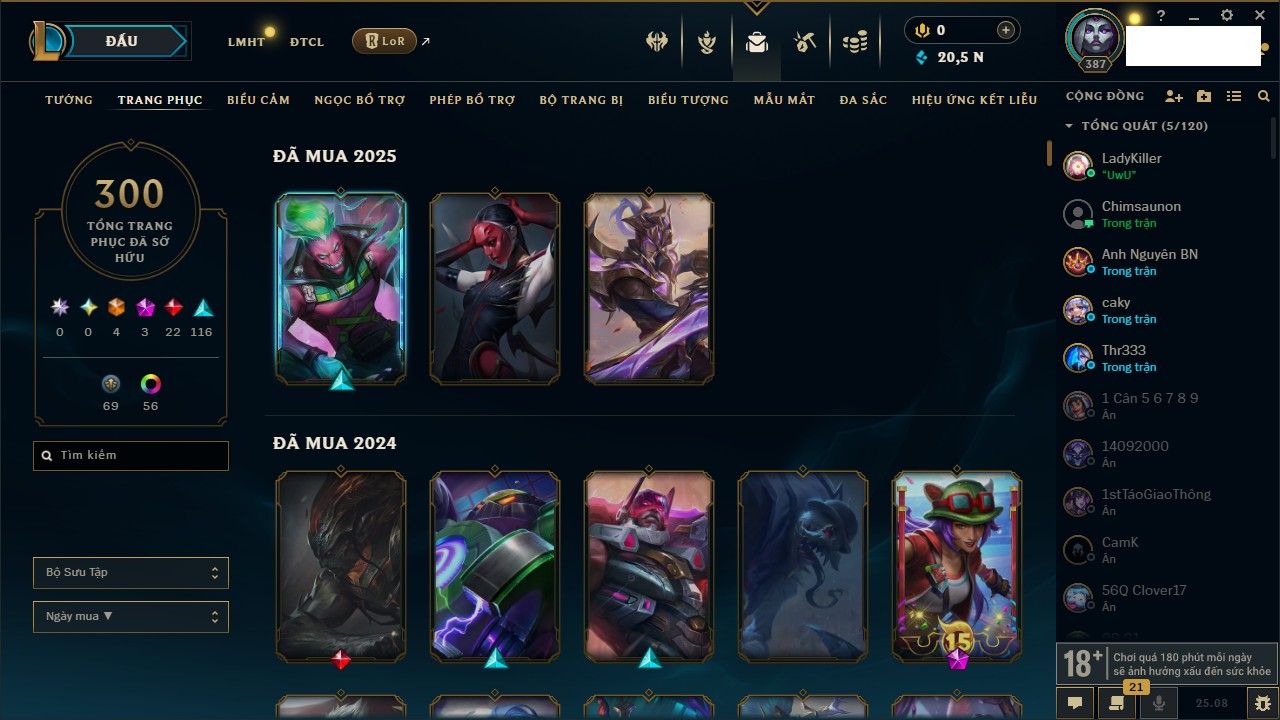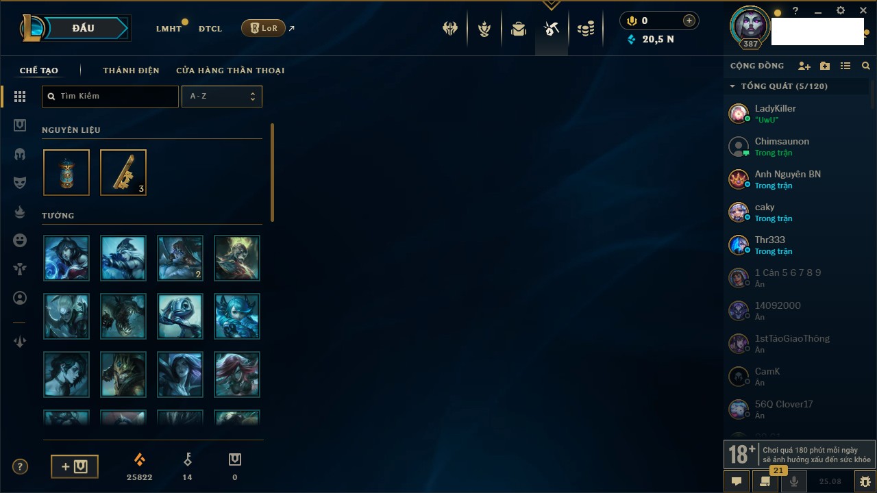 Rank Đơn: Bạc IIIKhung: BạcTướng: 170 - Còn 42417 THXTrang Phục: 262Rank ĐTCL: Chưa RankLinh Thú: 132