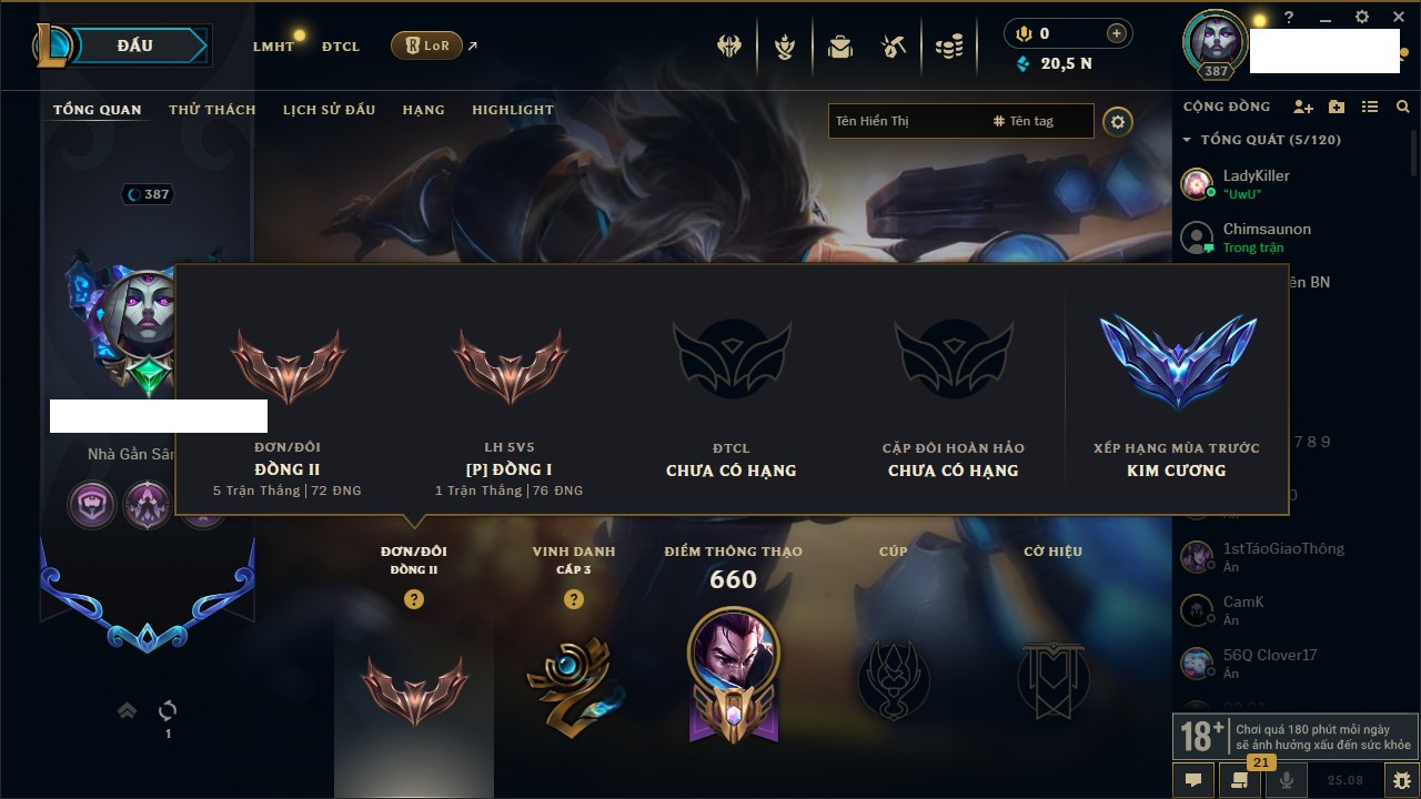 Rank Đơn: Bạch Kim IIIKhung: Bạch kimTướng: 170 - Còn 66107 THXTrang Phục: 201Rank ĐTCL: Chưa RankLinh Thú: 83