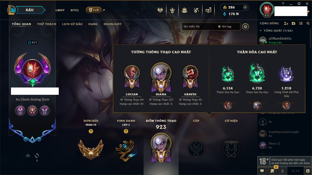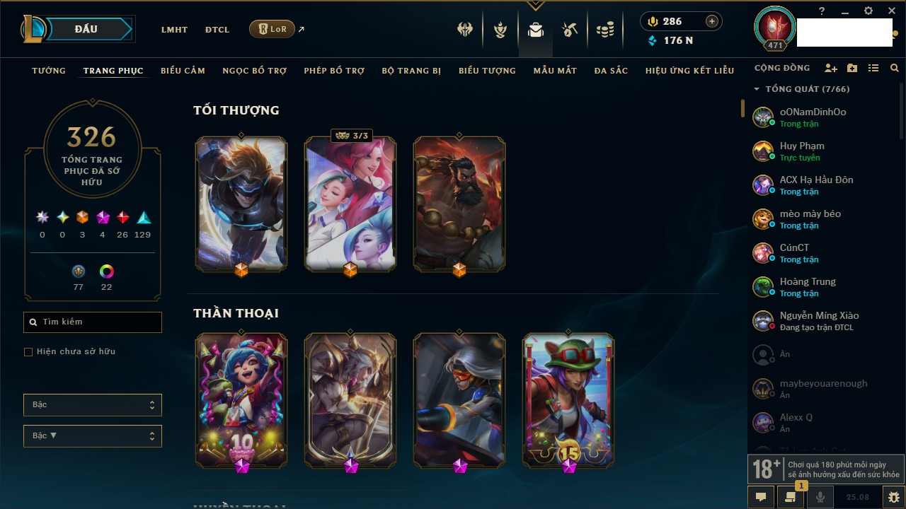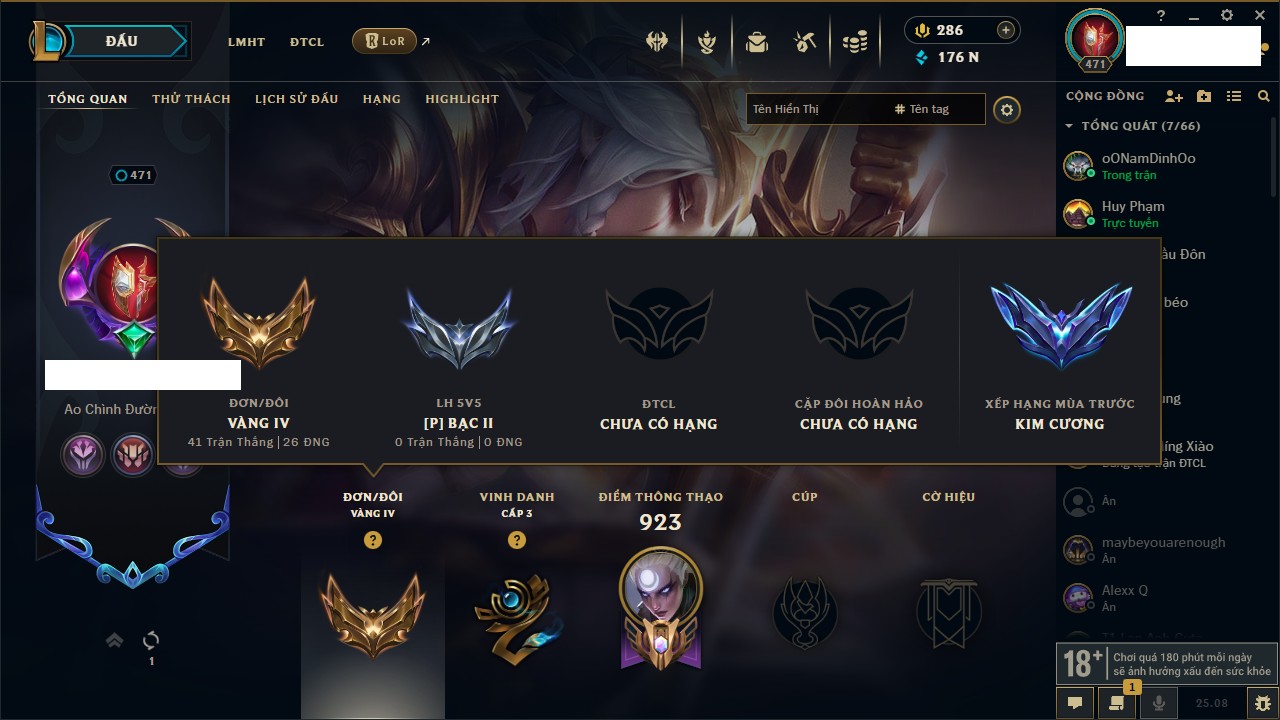 Rank Đơn: Bạch Kim IVKhung: Bạch kimTướng: 172 - Còn 326966 THXTrang Phục: 234Rank ĐTCL: Kim Cương IVLinh Thú: 167