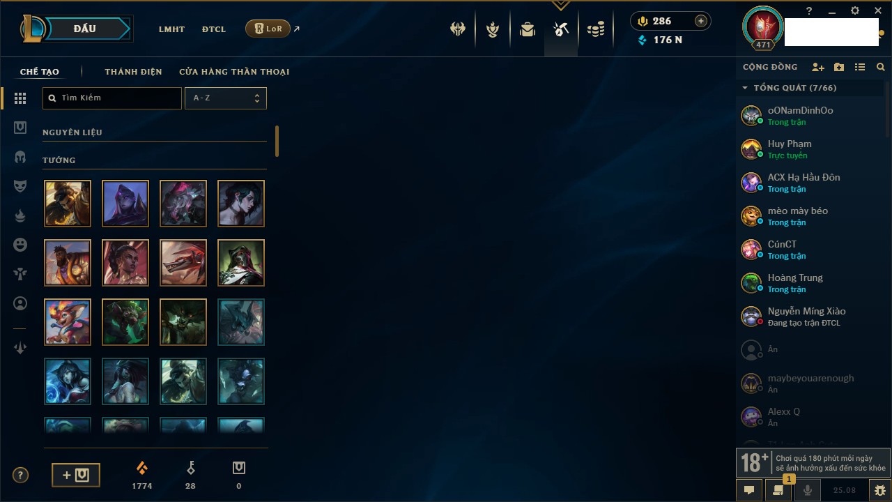 Rank Đơn: Chưa RankKhung: Chưa có khungTướng: 169 - Còn 43188 THXTrang Phục: 205Rank ĐTCL: Chưa RankLinh Thú: 259
