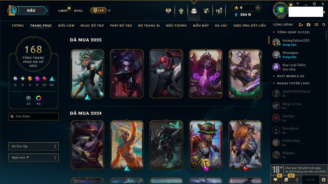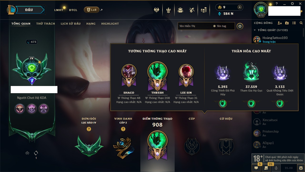 Rank Đơn: Bạch Kim IVKhung: VàngTướng: 170 - Còn 30440 THXTrang Phục: 205Rank ĐTCL: Chưa RankLinh Thú: 88
