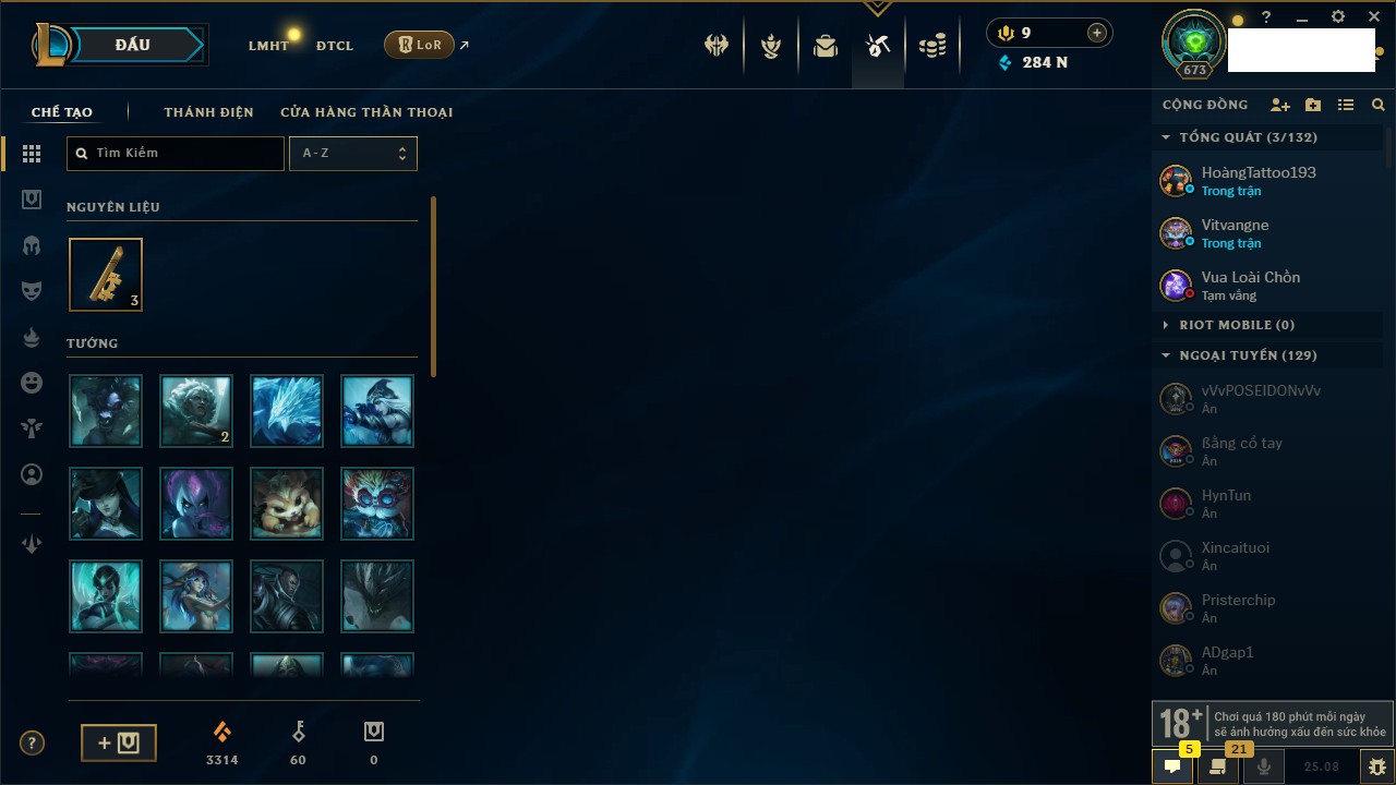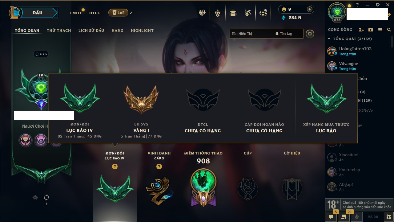 Rank Đơn: Bạch Kim IVKhung: Bạch kimTướng: 172 - Còn 326966 THXTrang Phục: 234Rank ĐTCL: Kim Cương IVLinh Thú: 167