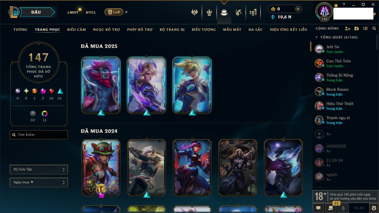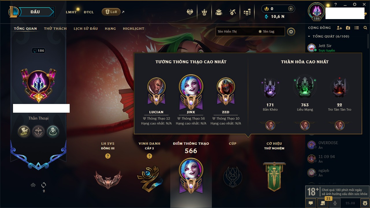 Rank Đơn: Vàng IKhung: VàngTướng: 155 - Còn 18217 THXTrang Phục: 63Rank ĐTCL: Chưa RankLinh Thú: 49
