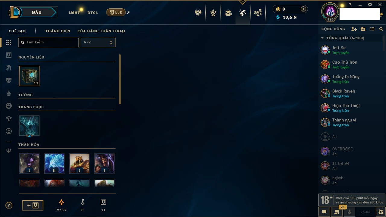 Rank Đơn: Bạch Kim IVKhung: Bạch kimTướng: 151 - Còn 16486 THXTrang Phục: 62Rank ĐTCL: Chưa RankLinh Thú: 12